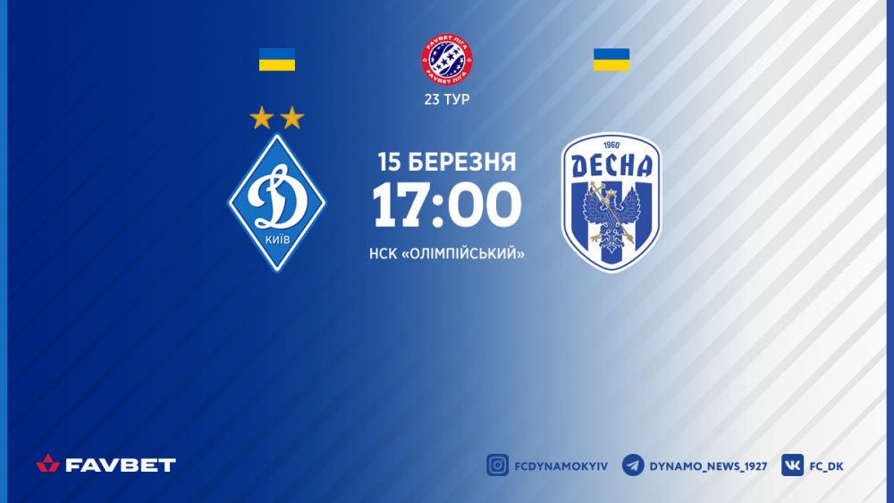 Матч “Динамо” - “Десна” відбудеться у неділю, 15 березня, на НСК “Олімпійський”. Стартовий свисток пролунає о 17:00.