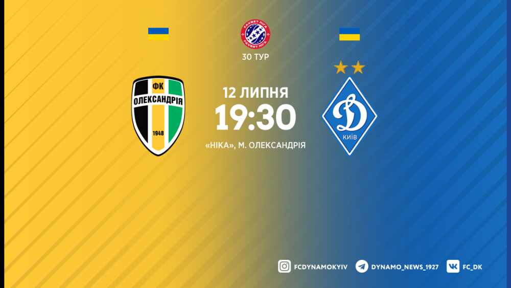 Матч 30-го туру УПЛ «Олександрія» - «Динамо» відбудеться у неділю, 12 липня, на КСК «Ніка». Початок - о 19:30, трансляція гри - на телеканалі «Футбол 1».