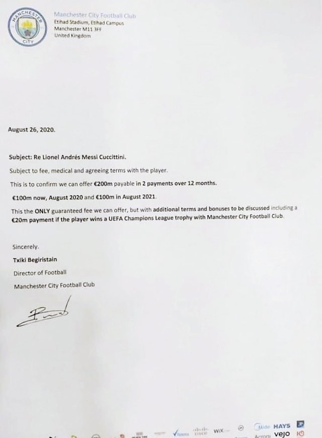 L'illustre опублікував документ, який розкриває деталі пропозиції. Відзначимо, що його підписав Чікі Бегірістайн, директор з футболу Манчестер Сіті.