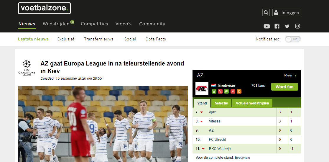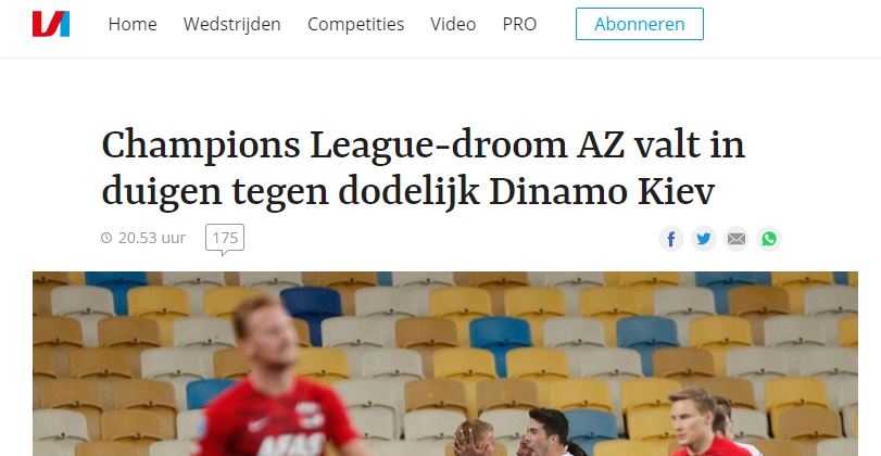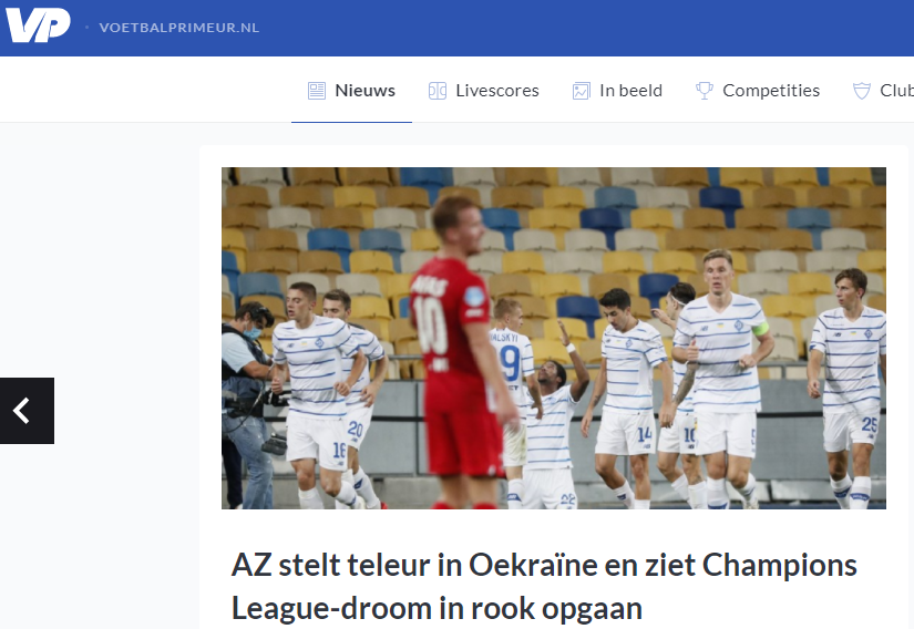 «АЗ вылетает в Лигу Европы после неудачного вечера в Киеве», - с таким заголовком опубликован отчёт о матче на сайте Voetbal Zone.