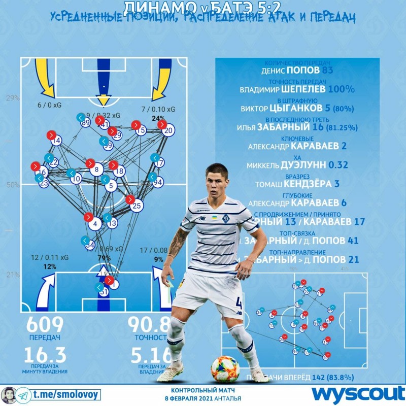 Из приметного можно отметить очень высокую «посадку» в первом тайме. В особенности Караваева. 70% владения обязывали катать мяч туда-сюда (100% точности передач Шепелева), у футболистов было достаточно времени расположиться на половине соперника. Топ-связкой после большого перерыва снова стала пара ЦЗ (41 передача друг другу).