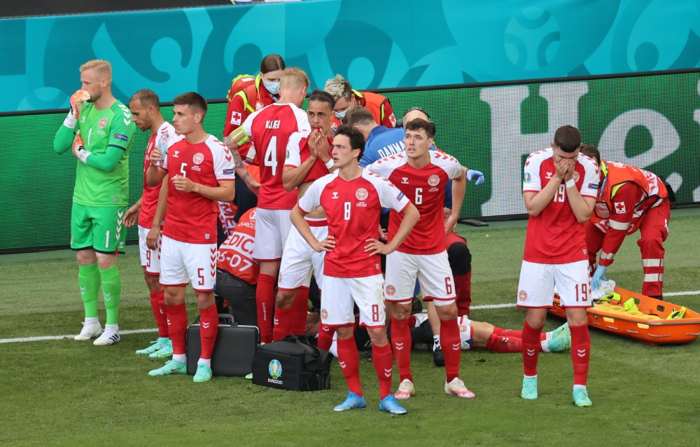 На 43-й минуте, при счете 0:0, полузащитник сборной Дании Кристиан Эриксен потерял сознание у кромки поля.