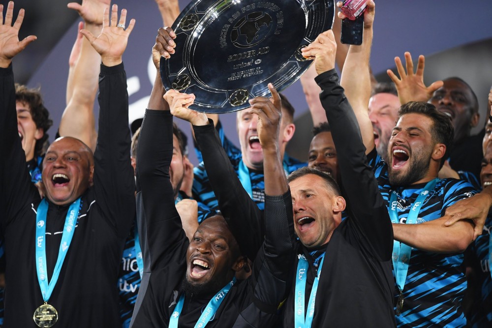 Капітаном гостей звично мав бути Усейн Болт. Однак перед стартом матчу рекордсмен світу та олімпійський чемпіон символічно передав пов'язку Андрію Шевченку. Так спортсмени вкотре привернули увагу громадськості до війни в Україні.