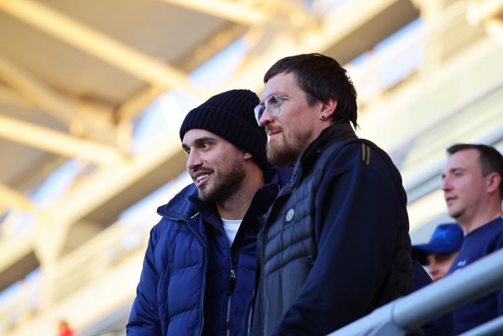 Український чемпіон світу з боксу Олександр Усик відвідав контрольний матч київського Динамо проти північномакедонського Сілексу та поспілкувався з президентом столичного клубу Ігорем Суркісом.