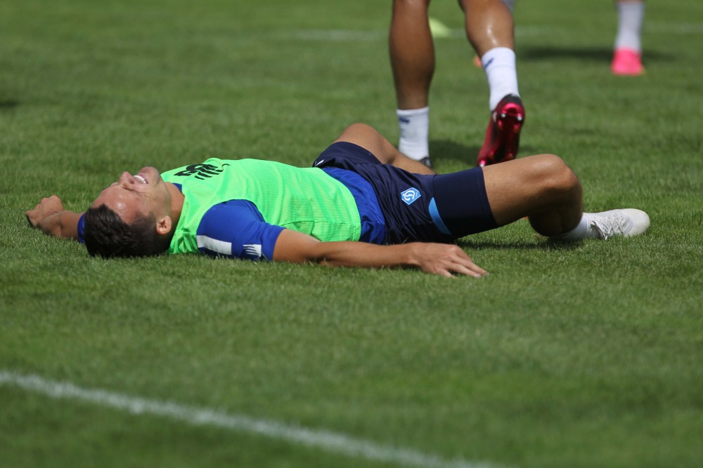 А завершилося перше заняття невеликим турніром на маленькому полі зі стандартними воротами. При цьому гравці були поділені на три команди у тренувальних манішках різних кольорів, які почергово змагалися одна з одною. У підсумку перемогли зелені манішки, з якими до останнього намагалися змагатися помаранчеві.