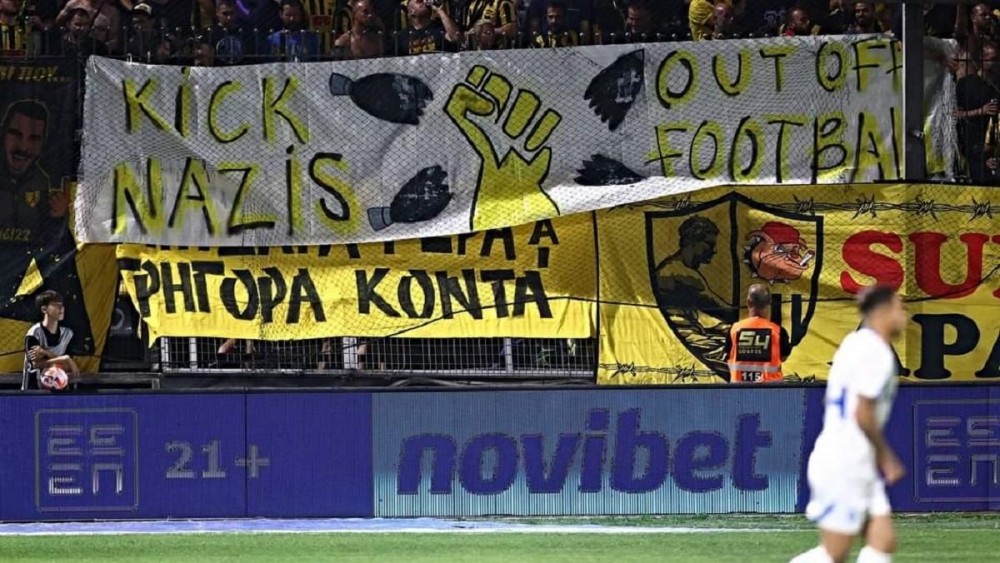 На перших хвилинах матчу грецькі фанати вивісили на трибуні банери з написами «Розгроміть нацистів Азова» та «Вибийте нацистів з футболу».