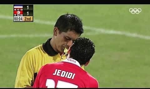 Втім, не географічна приналежність красить людину, а її вчинки. Наприкінці 78-ї хвилини поєдинку, що проходив на стадіоні «Пампелопоннісіако» у Патрах, за рахунку 1:1 захисник сербів Боян Незірі, який на той час виступав за донецький «Металург», порушив правила у своєму штрафному майданчику, і арбітр призначив пенальті у ворота європейців. Реалізувати його зголосився лідер магрібців Мохамед Жедіді, який незадовго до того у складі своєї національної збірної став переможцем Кубка Африканських націй, і впевнено впорався із завданням. Він уже готовий був опинитися в обіймах партнерів, але Аріїотіма попросив перебити, оскільки, на його думку, хтось із тунісців вбіг у штрафний майданчик до удару.