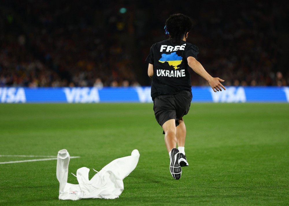 У середині першого тайму на поле вибіг уболівальник, який був одягнений у маску та футболку на підтримку України.