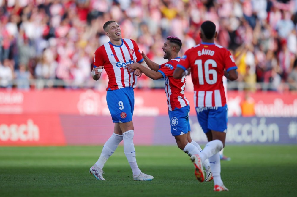 Та «біло-червоні» зуміли змінити хід гри ще до перерви. На 37-й хвилині Мартін скоротив відставання. Не давши господарям оговтатись, Артем Довбик зрівняв рахунок: український форвард обмінявся передачами з Бліндом, вийшов віч-на-віч з голкіпером і пробив у дальній кут. Забивши, наш земляк став найкращим бомбардиром Жирони у поточному сезоні. Проте українець і не думав спинятися. Під завісу першого тайму Артем оформив дубль та вивів Жирону вперед.