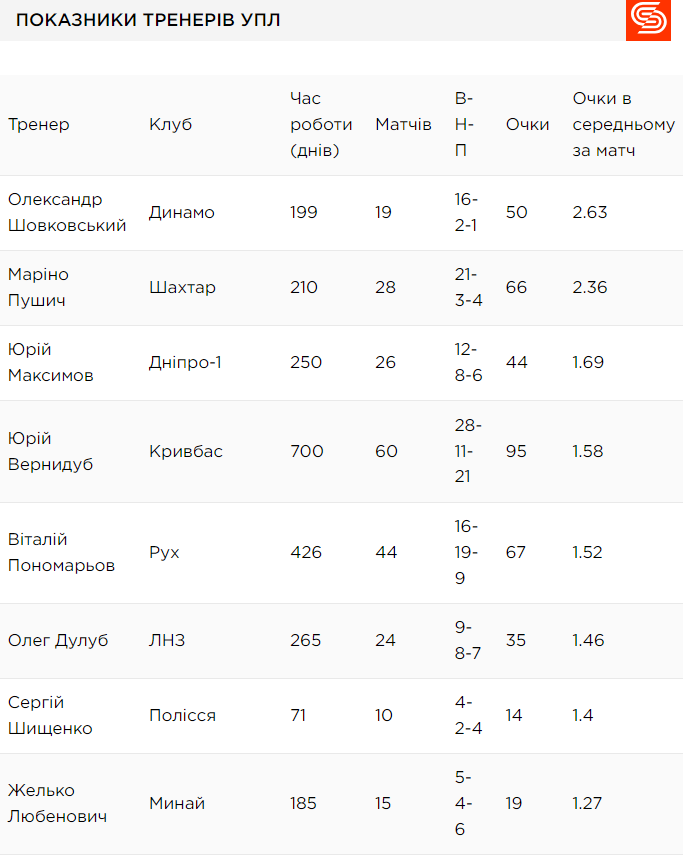 Відразу обмовимося, рейтинг досить умовний із кількох причин. По-перше, за часом роботи наставника: наприклад, головний тренер Колоса Олександр Поздєєв з першою командою не працює й місяця, тоді як Роман Григорчук із Чорноморцем – понад два роки. По-друге, за якістю матчів. Головний тренер Шахтаря Маріно Пушич, який видав фантастичну серію з Гірниками у внутрішніх турнірах, програвав у єврокубках, як і наставник Зорі Юрій Коваль. По-третє, ясна річ, цифри не враховують кадровий потенціал команд: з Динамо, наприклад, очки набирати простіше, ніж, без образ і пристрастей, з Вересом чи Минаєм.