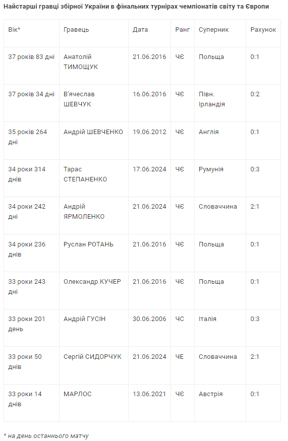 У більш «поважному» віці брали участь у світовому та європейському форумах лише вісім гравців. У тому числі 34-річні Тарас Степаненко та Андрій Ярмоленко, які посідають у списку ветеранів відповідно 4-ту та 5-ту позиції.