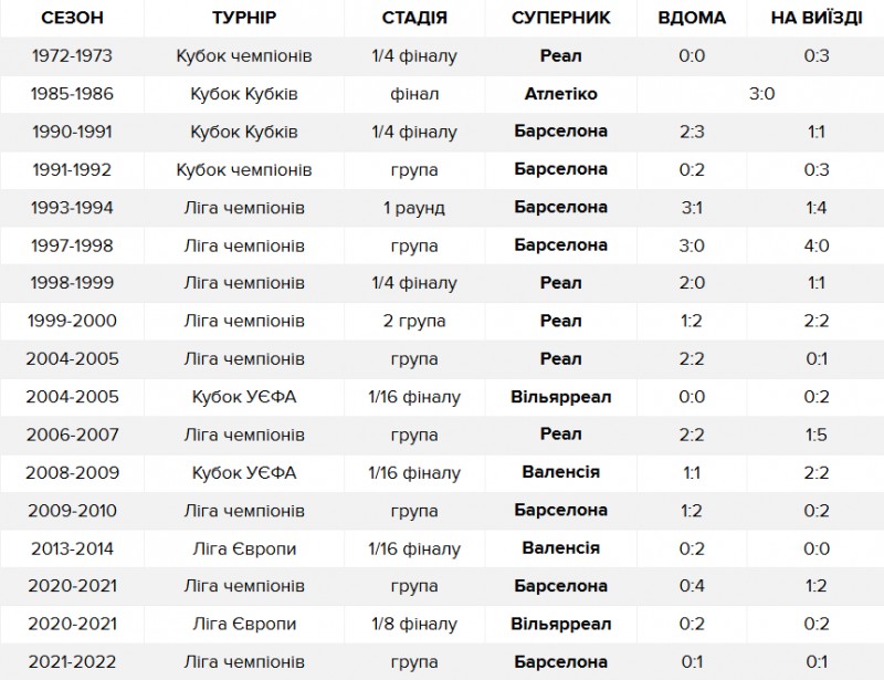 Для киян це буде вже 33-тя зустріч проти команд з Іспанії. З представниками жодної іншої країни Динамо не грало частіше. Проте успіхи «біло-синіх» не назвеш крутими – всього п'ять перемог при 10-ти нічиїх та 18-ти поразках.