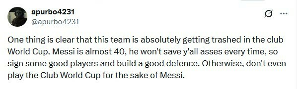 apurbo4231: Ясно одне, що ця команда буде абсолютно розбита на клубному чемпіонаті світу. Мессі майже 40, він не буде кожного разу рятувати вас, тому підпишіть кілька хороших гравців і створіть хороший захист. Інакше навіть не грайте на клубному чемпіонаті світу заради Мессі.