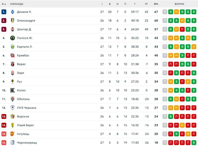 Цікаво і в зоні вильоту та перехідних матчів. Чорноморець та Інгулець залишились на дні таблиці з 18 та 20 пунктами відповідно, але досі зберігають примарні шанси на збереження прописки. Куди позитивніше все в Лівого Берега (23) та Ворскли (24), які перебувають у зоні перехідних матчів – до рятівного 12-го місця 4 та 3 бали відповідно.