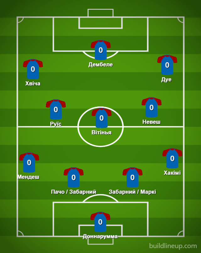 Подивимося, як би виглядав склад ПСЖ з українцем. Схема, яку найчастіше використовував Луїс Енріке в кампанії 2024/25 – 4-3-3. У цій системі Забарного можна уявити як на місці Маркіньйоса, так і на місці Пачо.