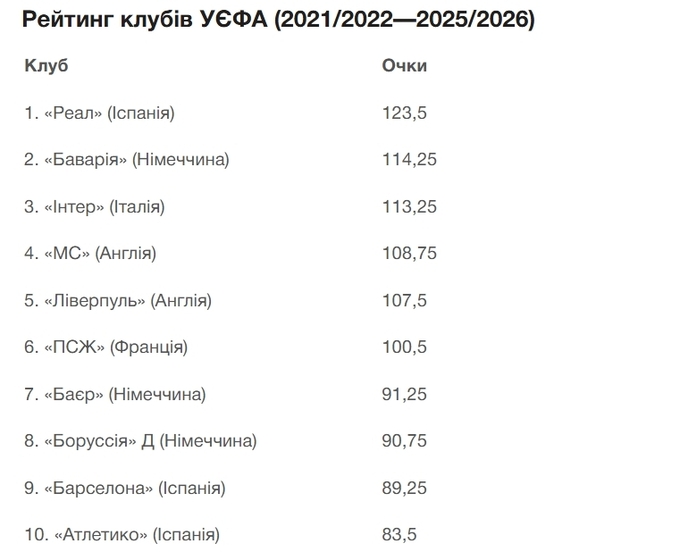 УЄФА оновив свій клубний рейтинг, а перше місце продовжує займати мадридський «Реал». Оскільки це результати за підсумками п'ятирічного циклу, чинний володар Ліги чемпіонів і фіналіст Клубного чемпіонату світу ПСЖ поки що займає лише 6-те місце.