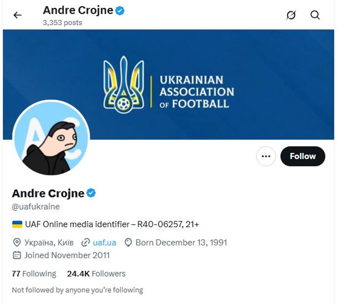 Зловмисники розмістили рекламу криптобіржі. Акаунт УАФ наразі називається «Andre Crojne».