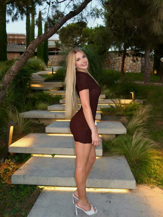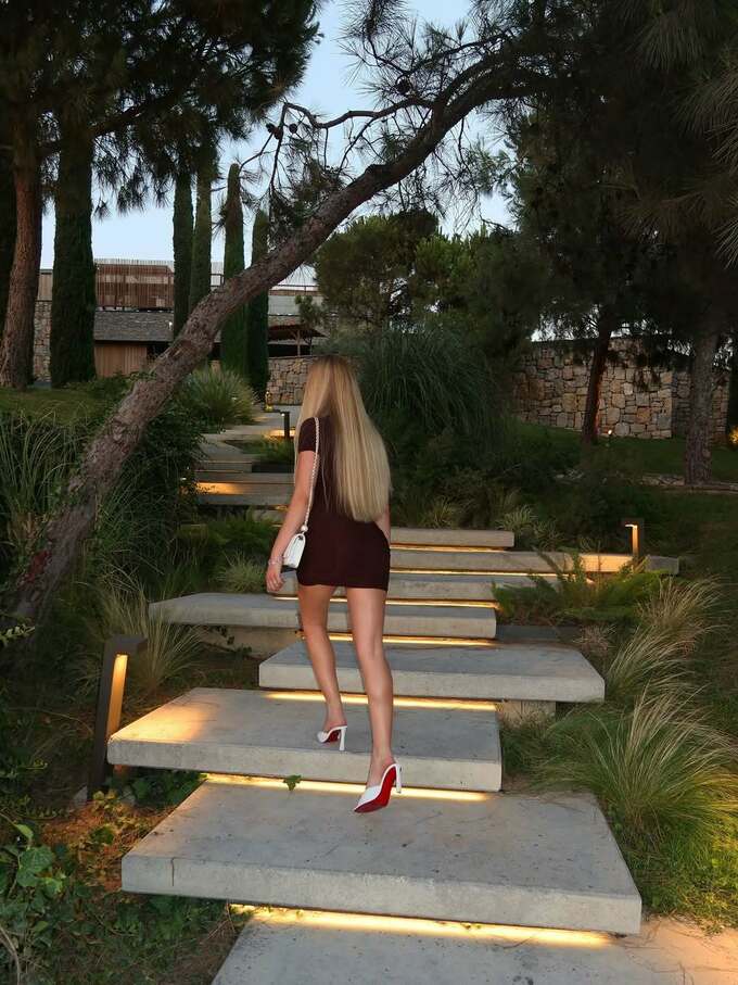 На знімку вона позує біля басейну на тлі гір — у бордовій сукні, з прямим волоссям і легкою усмішкою. Її образ викликав захоплення підписників і був названий втіленням стилю.