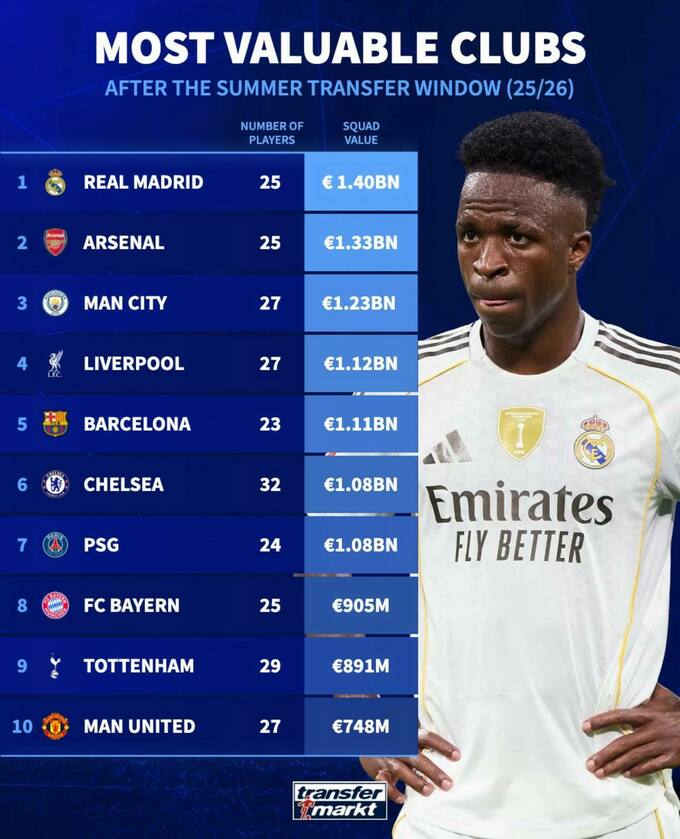 Лідер залишився незмінним – склад мадридського «Реалу», до якого входять 25 гравців, оцінюється у 1.4 млрд євро.