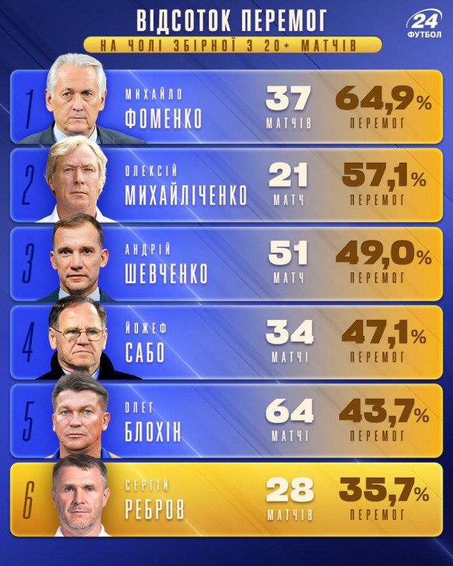 Тренер Сергій Ребров є менеджером з найменшим відсотком перемог у 20+ матчах в історії збірної України – 35.7% (28 поєдинків, 10 перемог).