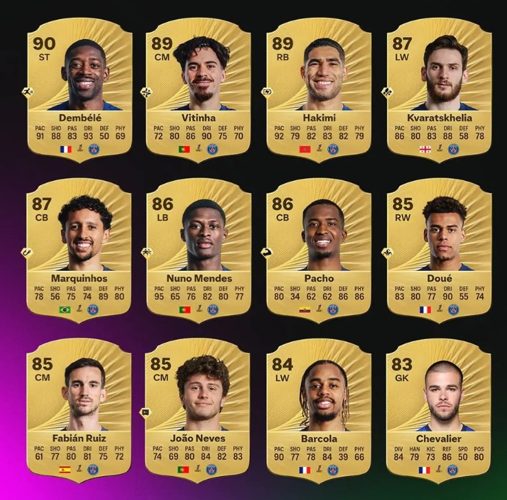 Найвищий рейтинг у Дембеле (90), Вітіньї (89) та Хакімі (89).