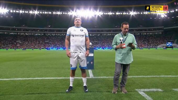 Усик був викликаний на арену перед початком поєдинку. Гравець житомирського Полісся поспілкувався із ведучими.