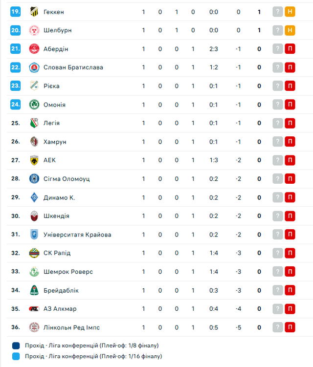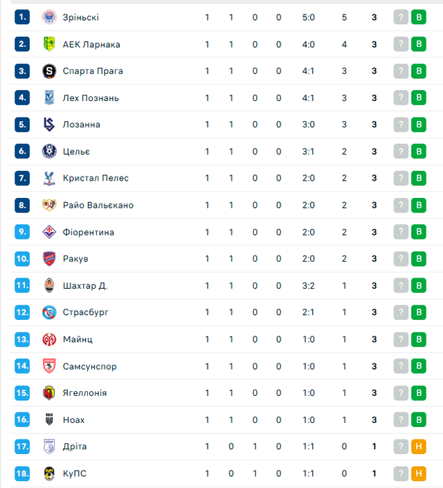 Варто виділити несподіваного лідера – боснійський Зріньскі, який за додатковими показниками видерся на вершину турнірної таблиці. У топ-5 також кіпрський АЕК, празька Спарта, польський Лех та швейцарська Лозанна.