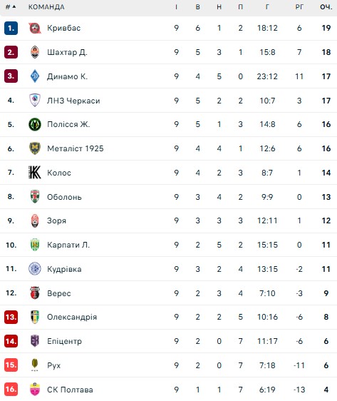 Дев'ятий тур чемпіонату України завершився і новим одноосібним лідером таблиці став криворізький Кривбас із 19 набраними очками.
