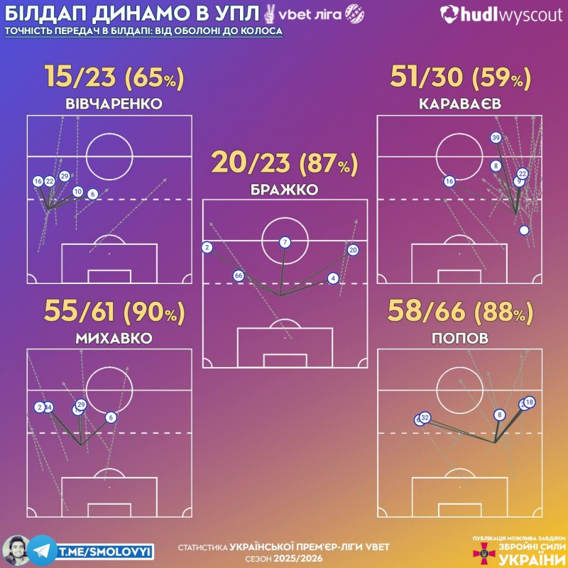 Попов менш варіативний: часто шукає свого ЛЦЗ (Михавко, Тіаре) або ближніх фулбеків (Караваєв, Тимчик). В останніх матчах додався маршрут на Піхальонка, доки відновлюється Шапаренко. Михавко у білдапі трохи точніший (+2%) і більш варіативний за напрямками.