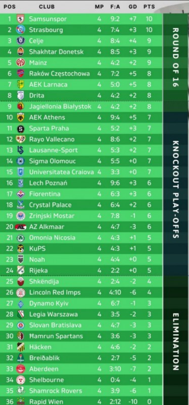 За підсумками четвертого туру основного етапу Ліги конференцій визначились одразу два лідери – турецький Самсунспор та французький Страсбур – по 10 очок. Далі йдуть одразу три команди з 9 балами – тішить, що серед них і Шахтар. Із сенсацій: словенський Целє та Дріта з Косова у топ-8, що дає їм можливість вийти у 1/8 фіналу напряму (попереду ще 2 тури).