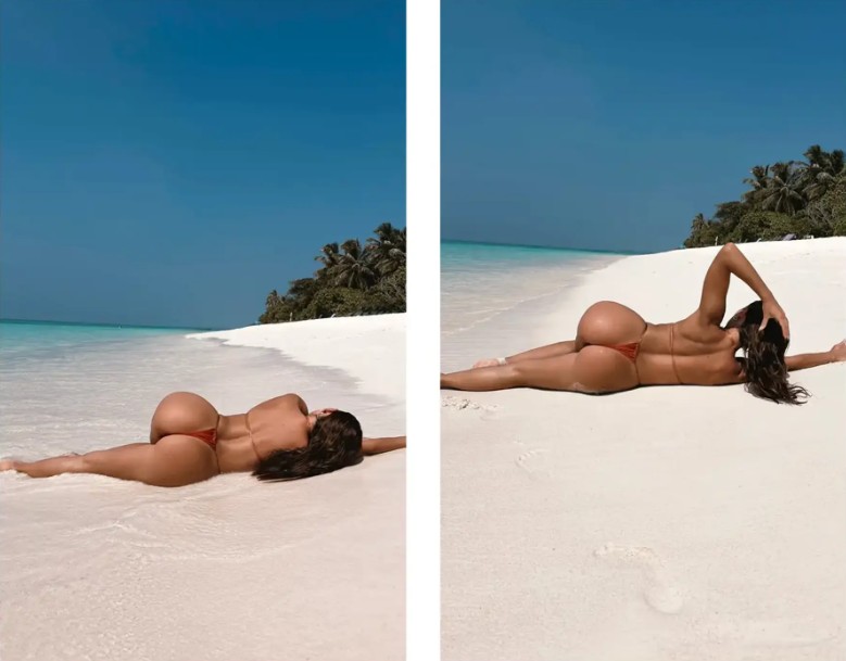 Фотосет зроблений просто на пляжі біля океану. На знімках дівчина позує у купальнику, лежачи на піску спиною до камери, зробивши акцент на фігурі.