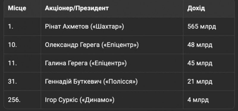 У президента «Полісся» Геннадія Буткевича 21 млрд грн і 31-ша позиція. 4 млрд має президент «Динамо» Ігор Суркіс (256-те місце).