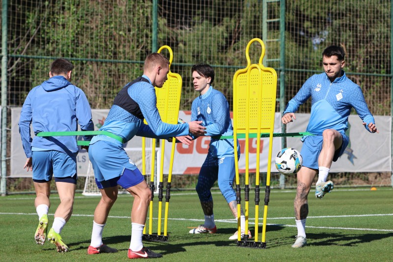 Ранкове почалося з активної розминки, в кінці якої гравці працювали в четвірках, звʼязані у парах фітнес-резинками. При цьому кожен мав віддавати точні передачі, не зачепивши тренувальний макет.