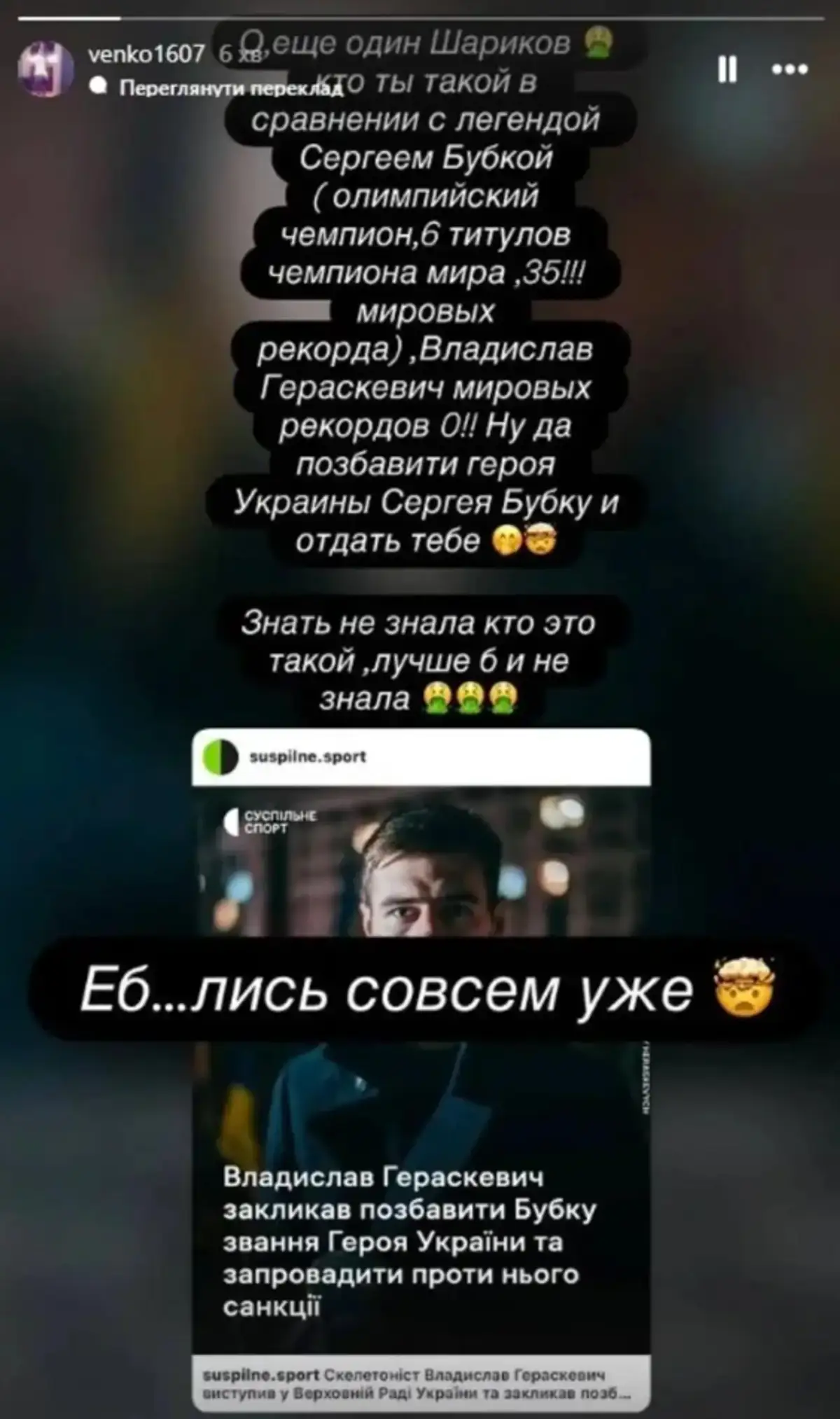 «О, ще один Шаріков. Хто ти такий у порівнянні з легендою – Сергієм Бубкою? Олімпійський чемпіон, 6 титулів чемпіона світу, 35 світових рекордів. Владислав Гераскевич – світових рекордів 0! Ну так, позбавити Героя України Сергія Бубку і віддати тобі. Знати не знала, хто це такий, і краще б не знала. Е#####ь зовсім уже», – написала в Інстаграмі дружина Георгія Бущана.
