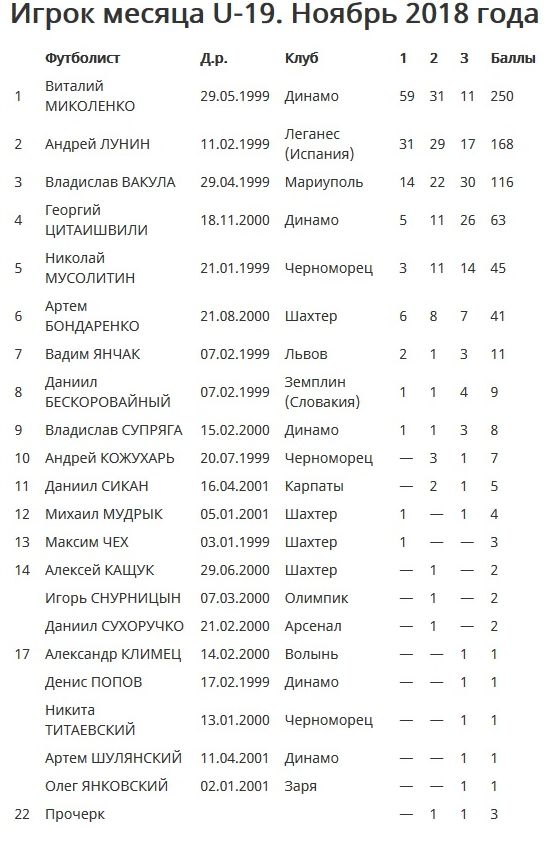 Голосуют у нас и болельщики — формируют коллективное мнение (и единую общую анкету) на сайте проекта. По ноябрьским итогам в категории U-19 свое мнение высказали 112 болельщиков, и оно полностью совпало с итоговым рейтингом: Миколенко, Лунин, Вакула.