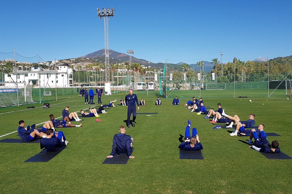 У першу чергу гравці виконали комплекс вправ зі стретчингу, спрямованих на відновлення та зміцнення м’язів, розстеливши фітнес-килимки по колу прямо на зеленому газоні поля, на якому тренуються наші голкіпери.