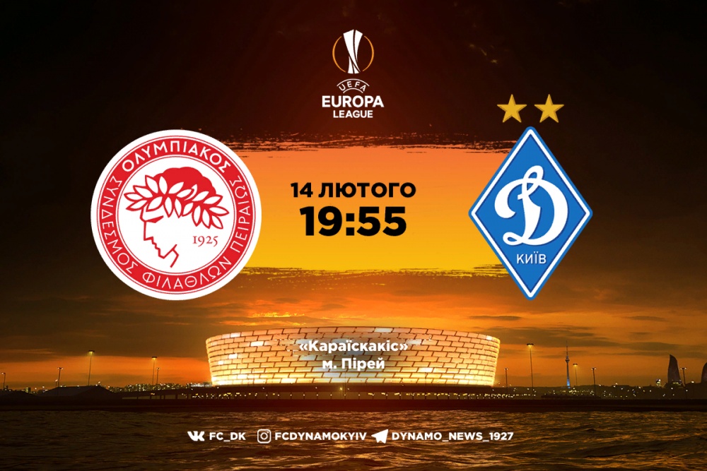 Матч «Олімпіакос» – «Динамо» розпочнеться о 19:55 у четвер, 14 лютого, у Піреї на стадіоні «Караїскакіс». Пряма трансляція гри відбудеться на телеканалі «Футбол 1».