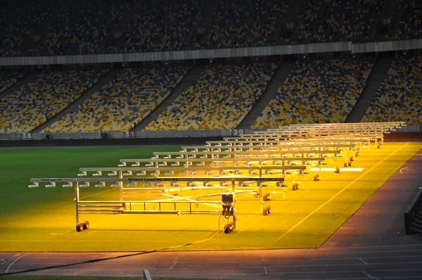 - Кожний із таких пристроїв для догляду за полем може одночасно освітлювати та обігрівати 700 квадратних метрів газону. Розмір газону НСК «Олімпійський» становить 7 887,5 кв.м., тобто кожні 14 годин штучне сонце буде «годувати» 2 100 кв.м. газону або 1/4 частина поля. Незважаючи на великі розміри установок, вони абсолютно не пошкоджують газон, тому що зроблені з алюмінію. Отже, не зважаючи на погодні умови, ми завжди готові проводити матчі, та наше поле – одне з найкращих у Європі, - директор з питань зовнішніх зв’язків Державного підприємства «Національний спортивний комплекс «Олімпійський» Віктор Анісімов.
