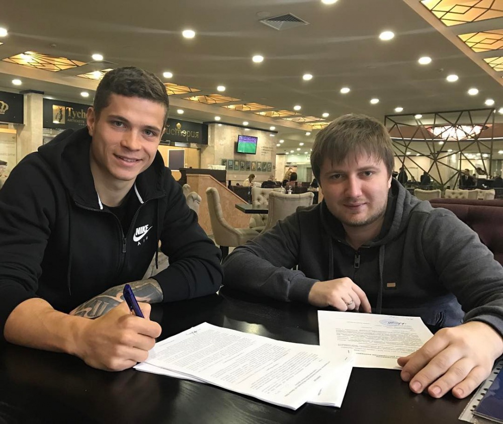 Новоспечений гравець «Крильєв Совєтов» Артем Громов зі своїм агентом Вадимом Шаблієм.