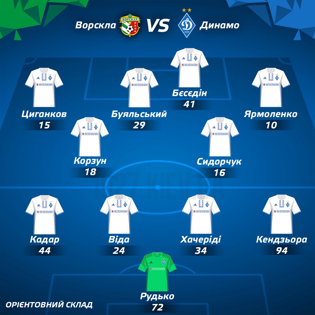 «Динамо»: Рудько - Кендзьора, Віда, Хачеріді, Кадар - Корзун, Сидорчук, Буяльський - Ярмоленко, Циганков, Бєсєдін