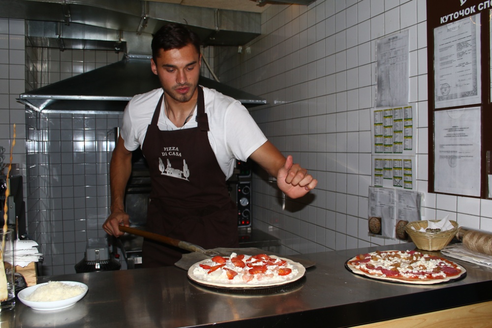 - У деяких піцеріях тісто роблять дуже пишним, шаром в декілька сантиметрів, - заспокоїв його кухар Сергій. – Всі наші піцци дуже смачні, соковиті, - підсумував майстер.