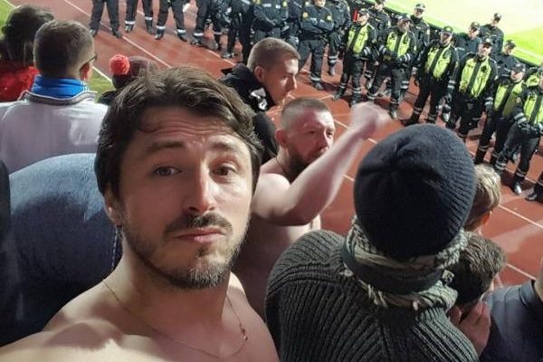 Видання сфотографувало Сергія в оточенні агресивних напівроздягнених уболівальників синьо-жовтих, написавши, що поліція протягом матчу спостерігала за розлюченими фанатами.