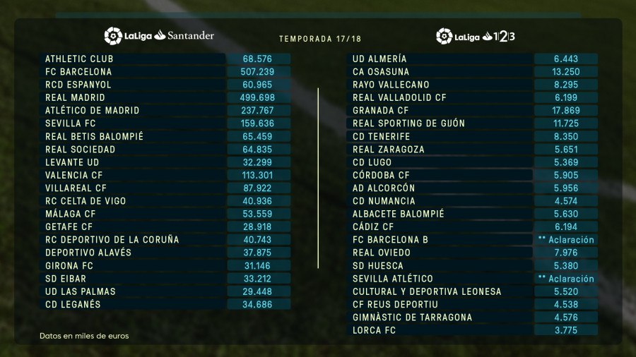 Першою в рейтингу стала «Барселона» (507 млн євро), другим - «Реал» (499 млн). На третьому місці з великим відставанням іде «Атлетіко» (237 млн).