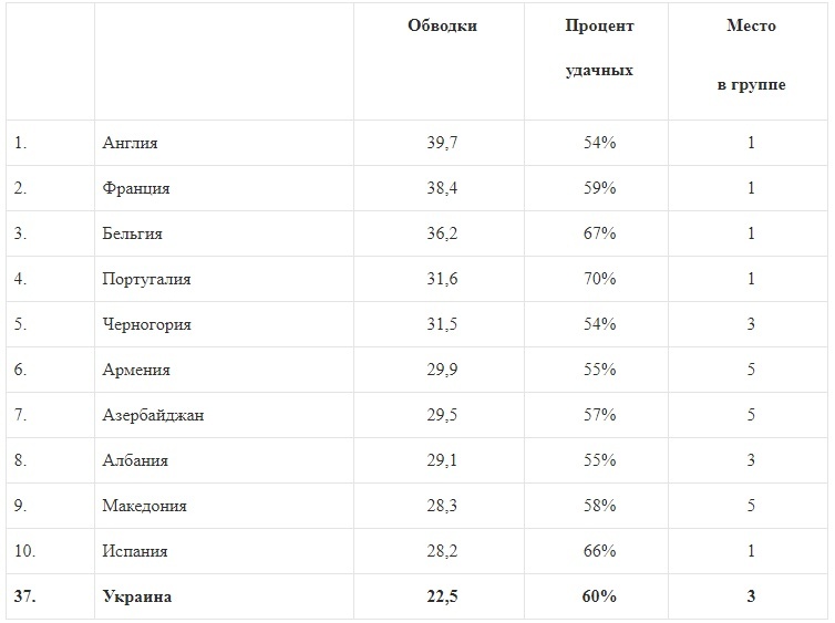 Втім, нашій команді це не допомогло. У загальному рейтингу обведень українці посіли лише 37-е місце серед 54-х учасників турніру. Звичайно, це пов'язано з тим, що крім Коноплянки та Андрія Ярмоленка, які забезпечили збірній України 55% всіх обведень, обігрувати у нас один на один просто нікому. Наприклад, в середині поля, де обведення завжди носили більш ефективний характер. Втім, особливо переживати з цього приводу теж не варто, адже ми, наприклад, випередили за кількістю обведень італійців, які завжди вміли приховувати свої недоліки за допомогою чіткої організації гри.