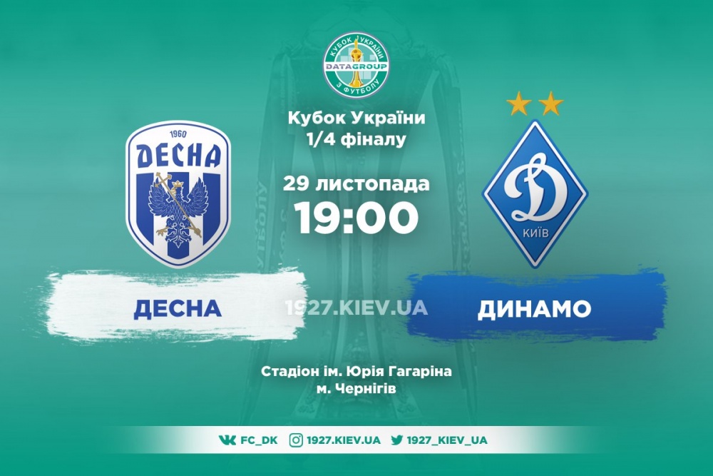 Поєдинок 1/4 фіналу Кубка України між «Десною» та київським «Динамо» відбудеться у середу, 29 листопада, на стадіоні імені Юрія Гагаріна в Чернігові. Початок - о 19:00. Трансляцію проведе телеканал 2+2.
