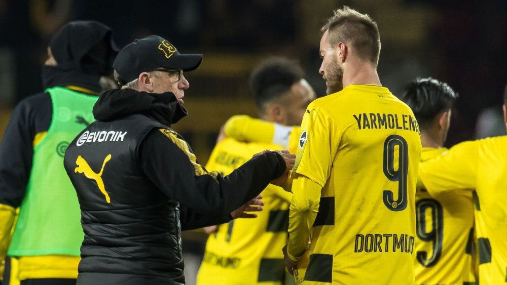 Стартовий склад «Боруссії» Д: Бюркі - Ярмоленко, Геррейро, Толян, Обамеянг, Пулішич, Кагава, Сократіс, Шмельцер, Вейгл, Топрак.