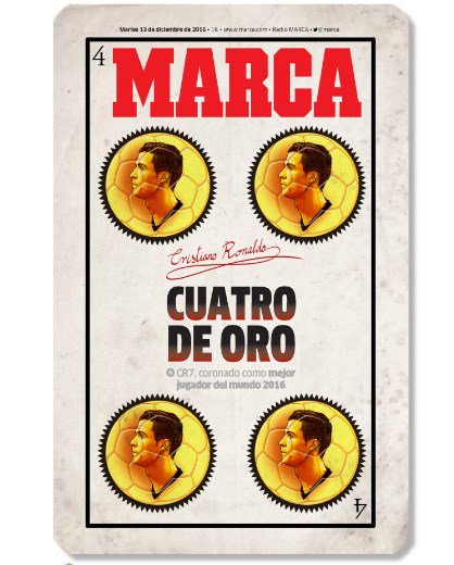 2. Четвёртый «Золотой мяч» Криштиану Роналду в Испании отметили обложкой в виде игральной карты. Хоть номинал карты и логичен, «четвёрка» как-то мелковата для португальца, не думаете?