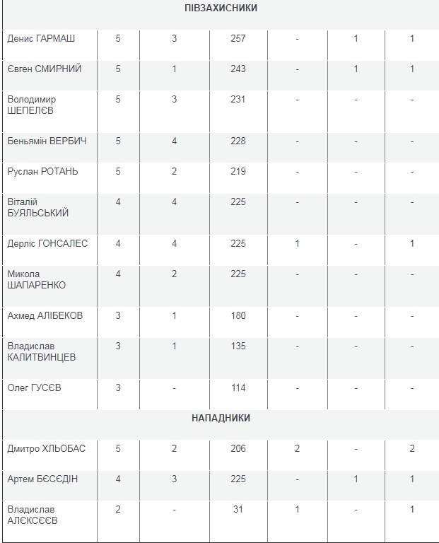 У всіх п’яти контрольних матчах зіграли десять футболістів. При цьому найбільше ігрового часу має півзахисник Денис Гармаш – 257 хвилин.