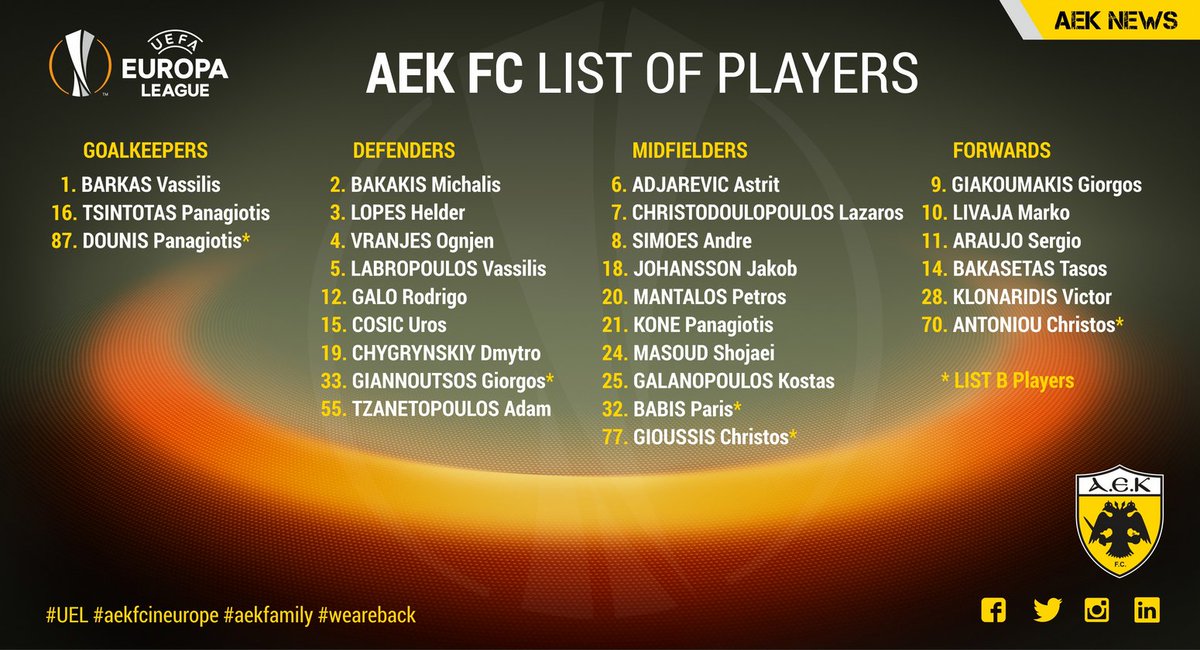 На матчі з київським «Динамо» в 1/16 фіналу турніру грецький клуб включив 23 футболісти за списком А і ще 5 гравців за списком В.