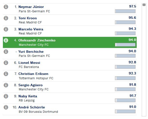 У числі кращих гравців значиться український півзахисник «Манчестер Сіті» Олександр Зінченко, якого поставили на четверте місце. Відзначимо, що футболіст збірної України випередив Ліонеля Мессі, а також Крістіана Еріксена і партнера по команді - Серхіо Агуеро.